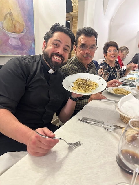 Deacon Dom & I, and Fr. Frankie Cicero excited about that plate of pasta!